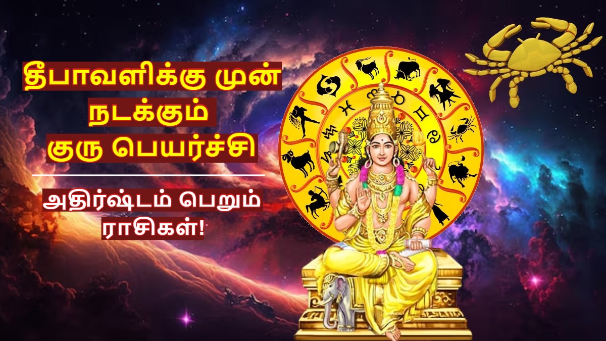Diwali 2025 Jupiter Transit In Cancer: பஞ்சாங்கத்தின் படி, இந்த ஆண்டின் தீபாவளி பண்டிகை அக்டோபர் 20 ஆம் தேதி வருகிறது. இந்த அக்டோபர் மாதத்தில் தான் தேவர்களின் குருவாக கருதப்படும் குரு பகவான் ராசியை மாற்றவுள்ளார். அதுவும் தீபாவளிக்கு 2 நாட்களுக்கு முன் குரு பகவான், தனது உச்ச ராசியான கடக ராசிக்குள் நுழையவுள்ளார்.
