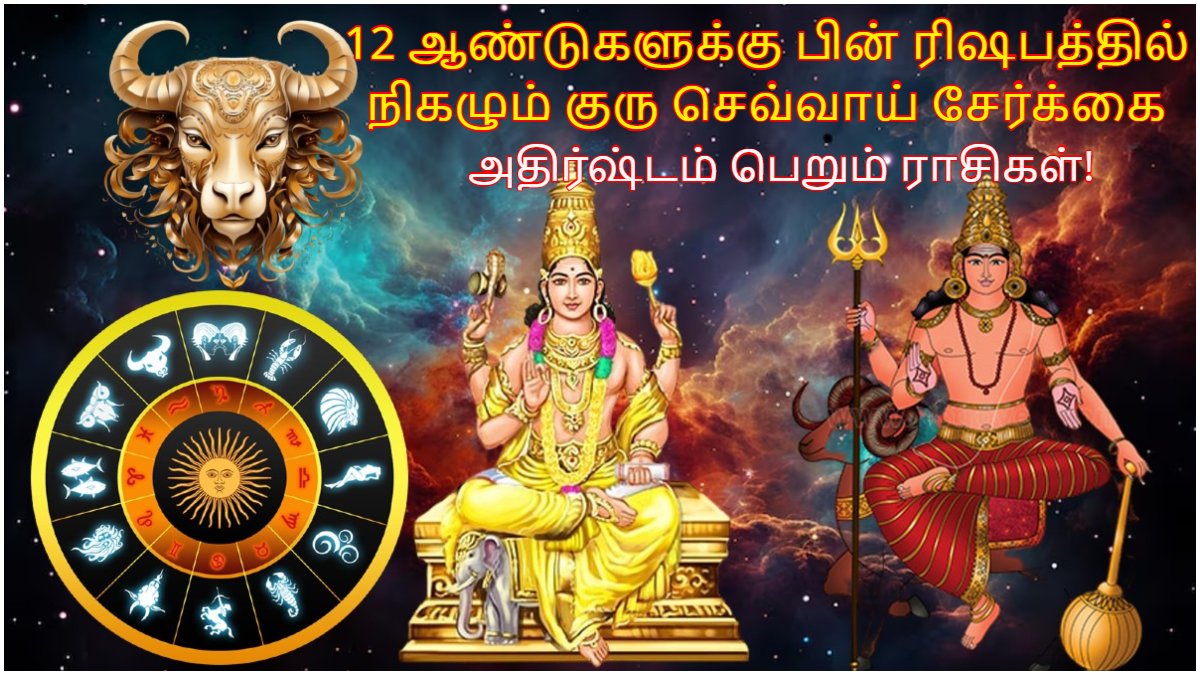 தற்போது இந்த குரு பகவான் 12 ஆண்டுகளுக்கு பின் ரிஷப ராசியில் நுழைந்து பயணித்து வருகிறார். இந்நிலையில் ஜூலை மாதத்தில் கிரகங்களின் தளபதியாக கருதப்படும் செவ்வாய் ரிஷப ராசிக்குள் நுழையவுள்ளார். இதனால் குரு மற்றும் செவ்வாயின் சேர்க்கை 12 ஆண்டுகளுக்கு பின் ரிஷப ராசியில் உருவாகவுள்ளது.