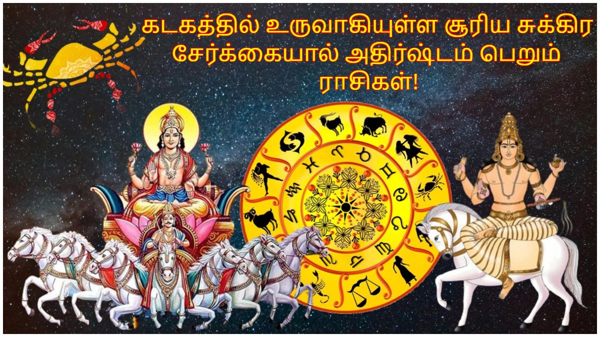 குறிப்பாக வெற்றிகள் மற்றும் செல்வம் குவியும். முக்கியமாக இந்த யோகம் ஜூலை 31 ஆம் தேதி வரை இருக்கும். அதன் பின் சுக்கிரன் சிம்ம ராசிக்குள் நுழைவார். இப்போது கடக ராசியில் உருவாகியுள்ள சூரிய சுக்கிர சேர்க்கையால் அதிர்ஷ்டம் பெறும் ராசிக்காரர்கள் யார்யார் என்பதைக் காண்போம்.