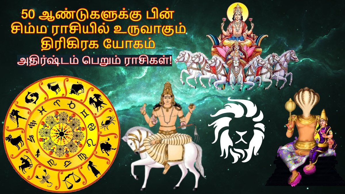 இந்த யோகத்தின் தாக்கம் அனைத்து ராசிக்காரர்களின் வாழ்க்கையிலும் தாக்கத்தை ஏற்படுத்தும். அதில் சில ராசிக்காரர்களின் அதிர்ஷ்டம் பிரகாசித்து, திடீர் நிதி ஆதாயங்கள் கிடைக்கும் வாய்ப்புக்கள் உள்ளன. மேலும் சிக்கிய பணம் கைக்கு வந்து சேரும். இப்போது 50 ஆண்டுகளுக்கு பின் சிம்ம ராசியில் உருவாகும் திரிகிரக யோகத்தால் அதிர்ஷ்டம் பெறும் ராசிக்காரர்கள் யார்யார் என்பதைக் காண்போம்.