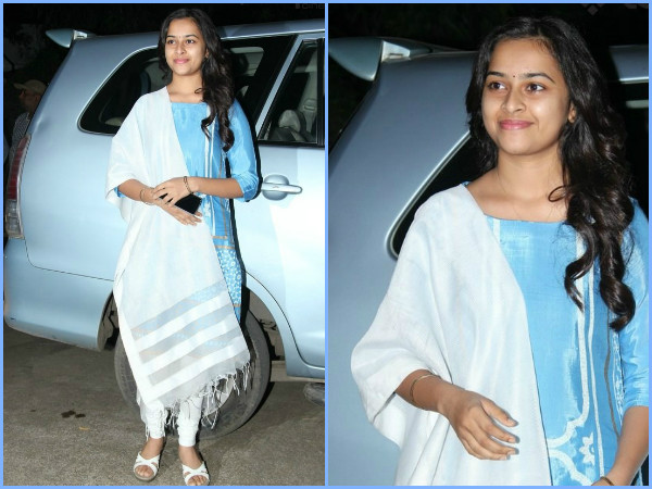 ஸ்ரீதிவ்யா நீலம் மற்றும் வெள்ளை கலந்த சுடிதாரில் வந்திருந்தார்.