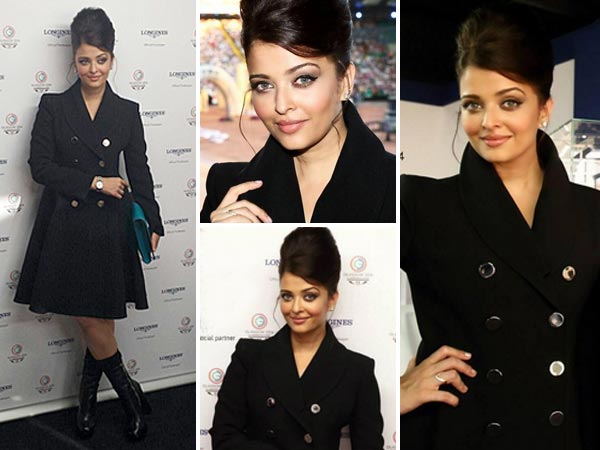 பொதுவாக ஐஸ்வர்யா ராய் பச்சனுக்கு கருப்பு நிற உடை அவரது அழகை அதிகரித்து வெளிக்காட்டும். அதை நன்கு தெரிந்து கொண்ட ஐஸ்வர்யா ராய், இந்த காமன்வெல்த் போட்டியின் முதல் நாளில் கருப்பு நிற முழங்கால் அளவுள்ள குஸ்ஸி கோட் அணிந்து ஹாட்டாக வந்திருந்தார்.