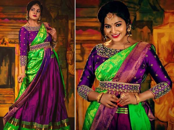 இது இன்ஸ்டாவில் பெல்ட் கொண்ட அடர் ஊதா நிற ப்ளைன் புடவை அணிந்து வி.ஜே. சித்ரா வெளியிட்ட போட்டோக்கள். இந்த ஃபோட்டோவும் இன்ஸ்டாவில் பல ரசிகர்களைக் கவர்ந்த ஃபோட்டோக்களாகும்.