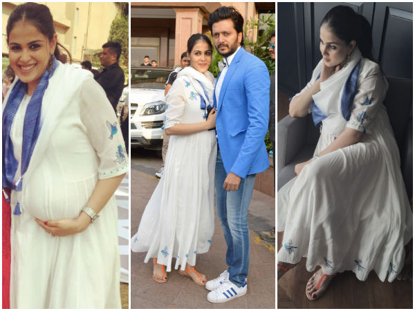 கர்ப்பமாக இருக்கும் ஜெனிலியா அர்பிதாவின் வளைகாப்பிற்கு பிரபல டிசைனர் அனிதா டாங்ரே டிசைன் செய்த வெள்ளை மற்றும் நீல நிறங்கள் கலந்த மேக்ஸி கவுன் அணிந்து வந்திருந்தார்.