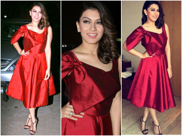 ஹன்சிகா இந்த சிவப்பு நிற கவுனில் ஏற்கனவே பளிச்சென்று காணப்படுவதால், மேக்கப்பை அளவாக போட்டு வந்திருந்தார். இதனால் அவரது தோற்றம் நன்றாக இருந்தது.