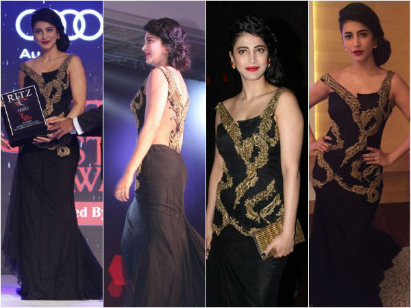 நடிகை ஸ்ருதிஹாசன் 2016 ரிட்ஸ் ஸ்டைல் விருது விழாவிற்கு டிசைனர் சோனாக்ஷி ராஜ் வடிவமைத்த கோல்டன் எம்பிராய்டரி கொண்ட கருப்பு நிற கவுன் அணிந்து வந்திருந்தார்.