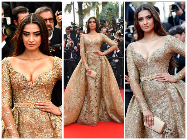சோனம் கபூர் அணிந்து வந்த கோல்டன் நிற எலீ-சாப் உடை மிகவும் லோ நெக் கொண்டிருந்ததால், அது அவரை செக்ஸியாக காட்டியது.