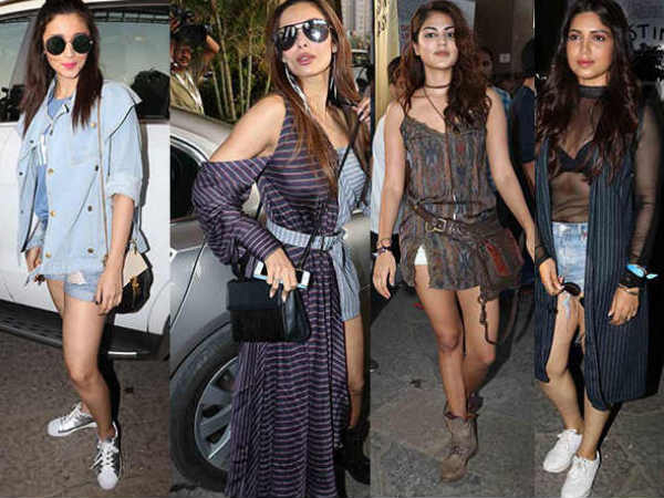 நடிகை மலாய்கா அரோரா கான் இருவேறு நீல நிறங்கள் கொண்ட கவுன் கலந்த மினி உடையை தேர்ந்தெடுத்து அணிந்து வந்திருந்தார். மேலும் இவர் கால்களில் பூட்ஸ் அணிந்து, கருப்பு நிற கூலிங் கிளாஸ் அணிந்து ஸ்டைலாக வந்திருந்தார்.