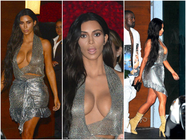 இது தான் கிம் அணிந்து வந்த மின்னும் சில்வர் நிற செக்ஸியான உடை.