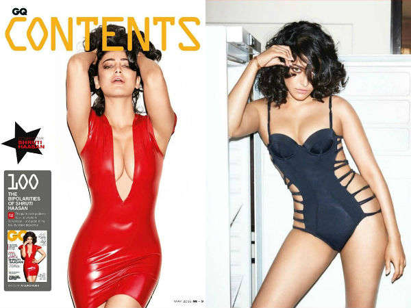 ஜி.கியூ பத்திரிக்கையின் மே மாத அட்டை படத்தில், சிவப்பு நிற டீப் வீ கட் ஷார்ட் ஸ்கர்ட்-ல் ஸ்ருதி ஹாசன்.