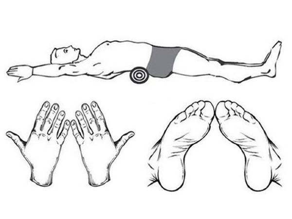 * ஒரு நடுத்தர அளவிலான டவலை சுருட்டி முதுகின் கீழ், தொப்புள் இருக்கும் இடத்திற்கு கீழே வைக்க வேண்டும்.