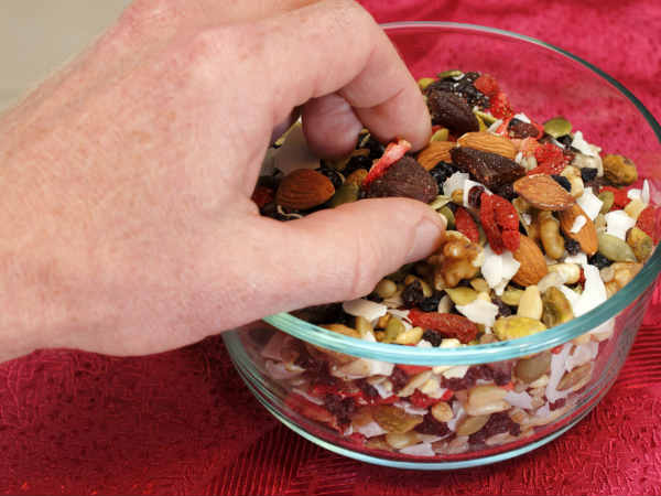 நட்ஸ் வகைகள் சாப்பிடலாம். பாதாம், முந்திரி, கிஸ்மிஸ், வால்நட், பிஸ்தா, கடலை போன்றவற்றை எடுத்துக் கொள்ளலாம். இது நீண்ட நேரம் பசியை மட்டப்படுத்தும்.