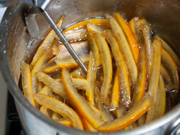 மூன்று கப் நீருடன் மூன்று கப் சர்க்கரை சேர்த்து, சர்க்கரை கரையும் வரை கொதிக்க வைக்கவும். பிறகு அதனுள் வெட்டப்பட்ட ஆரஞ்சு தோலை போட்டு முழு நிலையில் கொதிக்கவிட்டு, உடனடியாக ஜூவாலையை குறைத்துவிட வேண்டும்.