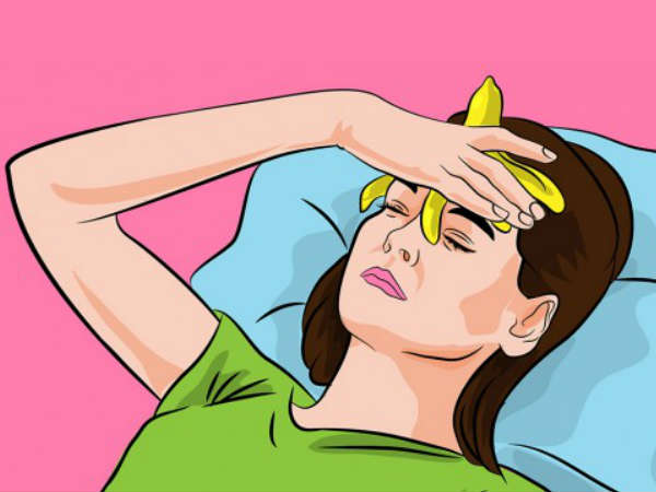 வாழைப்பழத் தோலின் உட்பகுதியில் ஐஸ் கட்டியை வைத்து ஒட்டும் டேப் கொண்டு தோலுடன் சேர்த்து ஒட்டி, பின் தரையில் படுத்து, நெற்றியின் மேல் வாழைப்பழத் தோலை 20 நிமிடம் வைத்திருக்க வேண்டும். குறிப்பாக கையில் ஒரு துணியை வைத்துக் கொண்டு, நெற்றியில் இருந்து வழியும் நீரை துடைத்துக் கொள்ளுங்கள்.