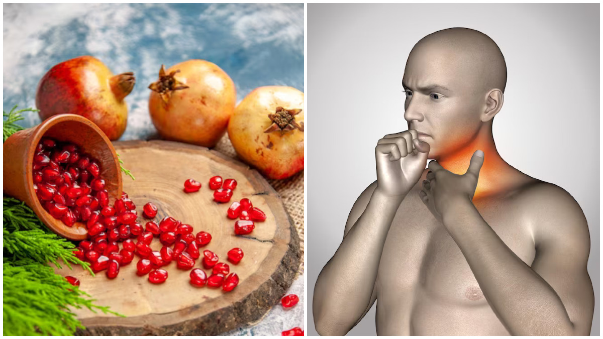 மாதுளை பழத்தில் அழற்சியை குறைக்கும் பண்புகள் உள்ளன. இந்த பழத்தில் நிறைய ஆன்டி ஆக்ஸிடன்கள், அஸ்ட்ரிஜெண்ட்கள் உள்ளன. இது தொண்டையை சுற்றியுள்ள திசுக்களை சுருக்கி வீக்கத்தைக் குறைக்கிறது. இதனால் தொண்டை வலியும் குறையும். மாதுளையில் வைட்டமின் கே, வைட்டமின் சி, ஃபோலேட், பொட்டாசியம், நார்ச்சத்துக்கள் மற்றும் புரதம் போன்ற சத்துக்கள் உள்ளன.