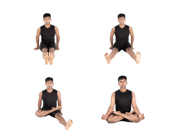 முதலில் தரையில் அமர்ந்து கொண்டு, கால்கள் இரண்டையும் நேராக நீட்டவும். பின் வலது காலை மடக்கி, இரண்டு கைகளாலும் இடது காலின் தொடை மீது, குதிகால் வயிற்றை தொடும் அளவிற்கு வைக்கவும். இதேப்போல் மற்றொரு காலையும் மடக்கி, வலது காலின் தொடையின் மீது, வயிற்றை தொடும் அளவிற்கு நெருக்கமாக வைக்கவும்.