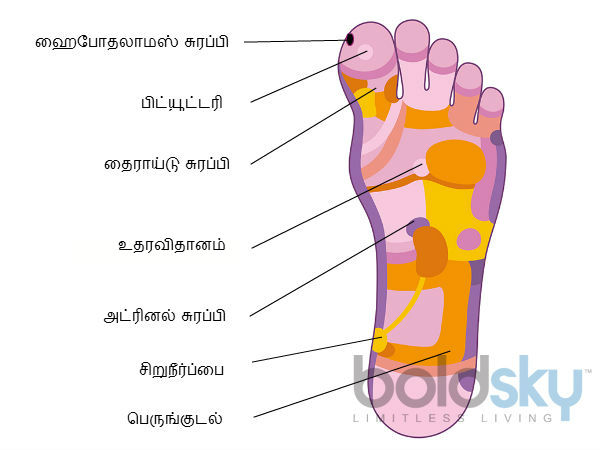 இனி, உங்கள் பாதங்களில் உள்ள ஏழு அழுத்தப் புள்ளிகளை தூண்டுவதனால், எந்தெந்த உடல் பாகங்களுக்கு உடல்நல நன்மைகள் ஏற்படுகின்றன என்று பார்க்கலாம்...