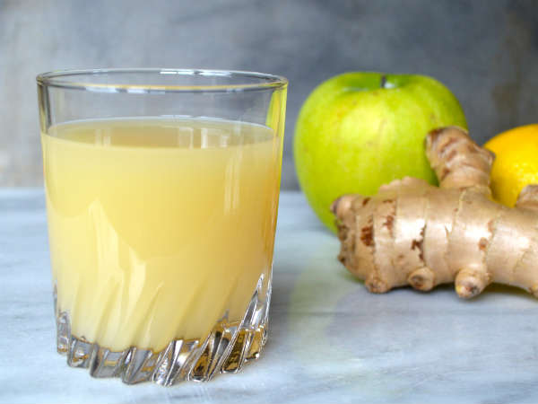 * பின்பு மிக்ஸியில் ஆப்பிளை தோலுரிக்காமல் துண்டுகளாக்கிப் போட்டு, அத்துடன் எலுமிச்சை சாறு மற்றும் இஞ்சி சேர்த்து, தண்ணீர் ஊற்றி அரைத்து வடிகட்டிக் கொள்ள வேண்டும்.