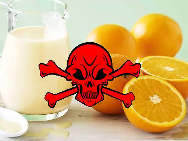 ஆரஞ்சு, கிரேப்ஃபுரூட், எலுமிச்சை, லிச்சி போன்ற சிட்ரஸ் பழங்களுடன் பால் பொருட்களை எப்போதும் சேர்த்து உட்கொள்ளக்கூடாது. ஏனெனில் சிட்ரஸ் பழத்தில் உள்ள அமிலம் பாலை திரிய வைத்து, வயிற்றில் நச்சு பொருட்களாக மாறி, மோசமான பிரச்சனைகளை ஏற்படுத்திவிடும். இம்மாதிரியான சூழ்நிலையில், சளி, இருமல் மற்றும் அலர்ஜி கூட ஏற்படலாம்.