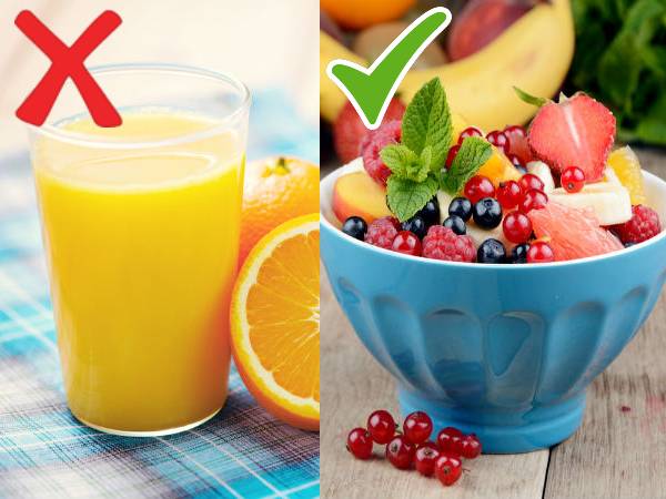 பழச்சாறுகளுக்கு பதிலாக பழங்களை சாப்பிடுங்கள். இது காலையில் செரிமான மண்டலத்தின் செயல்பாட்டை தூண்டுவதற்கான சிறந்த வழி மற்றும் மதிய வேளையில் உயர் கலோரி உணவுகளை உண்பதற்கும் தயார் செய்கிறது.