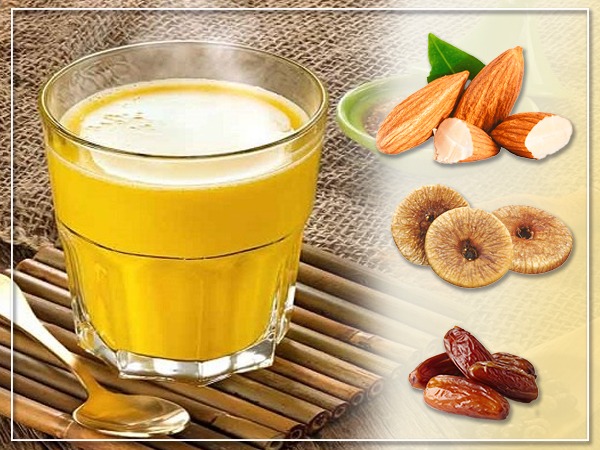 ஊட்டச்சத்து விஷயத்தில் பேரிச்சம்பழம் சிறந்த உலர் பழங்களில் ஒன்றாகும் என்று கூறப்படுகிறது. அவை குடல் இயக்கத்தை மேம்படுத்துவது மட்டுமல்லாமல், செறிவு அளவையும் மேம்படுத்துகின்றன. பேரீச்சம்பழம் தங்கப் பாலில் சேர்க்கப்படும் போது, இது மெக்னீசியம், பொட்டாசியம் மற்றும் பாஸ்பரஸ் போன்ற பல தாதுக்களில் நிறைந்திருப்பதால் இரத்த சர்க்கரை அளவை மேம்படுத்த உதவும். மேலும், இந்த உலர் பழம் மூட்டு வலியைப் போக்கவும் உதவுகிறது.