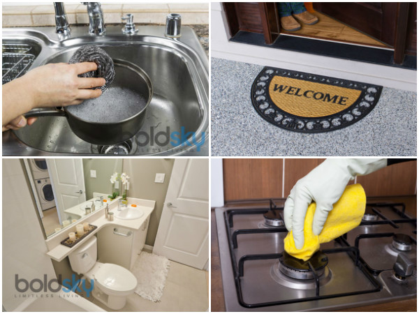 இரவில் படுக்கும் முன், உணவு சமைத்த பாத்திரங்கள் மற்றும் உணவு உண்ட தட்டுகள் என அனைத்தையும் கழுவி, பாத்திரம் கழுவும் இடத்தில் எலுமிச்சை சாறு மற்றும் வினிகர் கலந்த கலவையால் சுத்தம் செய்துவிட வேண்டும். இதனால் பாத்திரம் கழுவும் இடத்தில் துர்நாற்றம் வீசுவதையும், பூச்சிகள் வருவதையும் தடுக்கலாம்.