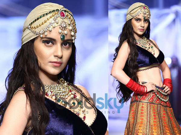 ஜே.ஜே.வலாயாவின் உடைகளை அணிந்து வரும் மற்றொரு மாடல் இவர் தான். கங்கனா தங்க வேலைபாடுகளுடன் கூடிய நீளமான லெஹெங்காவை அணிந்து நடந்தார்.