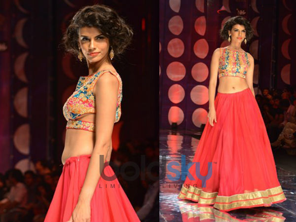 இந்த லெஹெங்காவில் நீளமான சோளி உள்ளது. சொல்லப்போனால், இந்த பிங்க் நிற சோளி ஒரு டாப்ஸ் தான். இந்த டாப்ஸில் இடுப்பு வரை இறுக்கமாகவும், அதற்கு பின் ப்ரில் கொண்டும் உள்ளது.