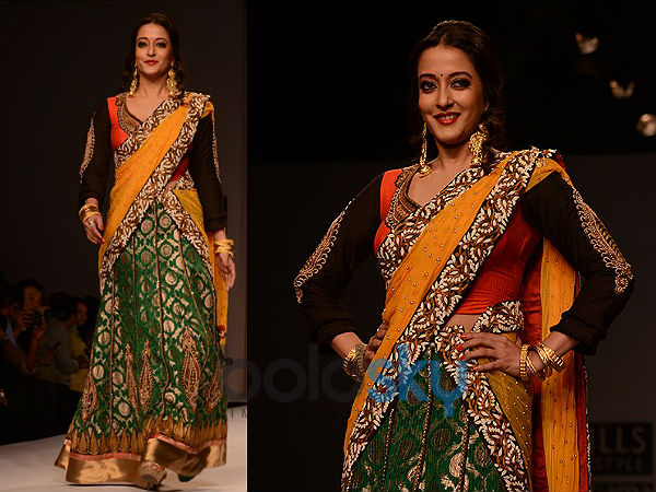 ரைமா சென் பலவண்ணம் கொண்ட சில்க் லெஹெங்காவை அணிந்து, அதற்கு அதிகப்படியான வேலைப்பாடுகள் செய்யப்பட்ட துப்பட்டாவை அணிந்து ராம்ப் வாக் நடந்தார்.