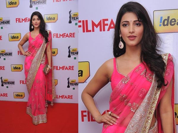 ஸ்ருதியை பல்வேறு மார்டன் உடையில் பார்த்திருப்போம். புடவையில் பார்த்திருக்கமாட்டோம். ஆனால் இதுவோ இந்த வருடம் நடந்த பிலிம்ஃபேர் விருது விழாவின் போது பிங்க் நிற புடவை அணிந்து வந்த போது எடுத்தது.