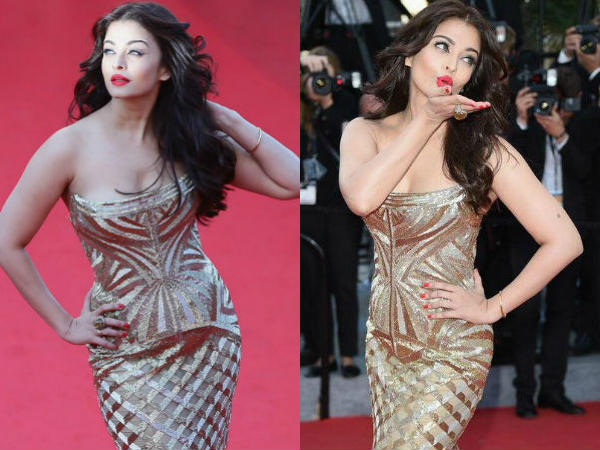 ஐஸ்வர்யா ராய் பச்சன் 2014 ஆம் ஆண்டு கேன்ஸ் விழாவிற்கு ராபர்டோ கவாலி வடிவமைத்த கோல்டன் நிற ஸ்ட்ராப்லெஸ் கவுனில் வந்திருந்தார்.