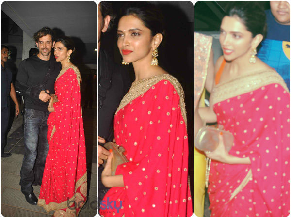 நடிகை தீபிகா படுகோனே செக்ஸி நிறமான சிவப்பு நிற எம்பிராய்டரி பார்டர் கொண்ட புடவையில் கண்களை பறிக்கும் அளவில் அழகாக வந்திருந்தார். அதிலும் இந்த புடவைக்கு இவர் மேற்கொண்டு வந்த ஹேர் ஸ்டைல் மற்றும் மேக்கப் அவரை அட்டகாசமாக வெளிக்காட்டியது.