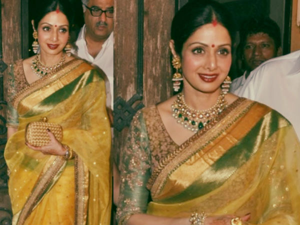 அத்தகைய கர்வா சவுத் கொண்டாட்டத்திற்கு நடிகை ஸ்ரீதேவியும் பங்கு கொண்டார். அப்படி பங்கு கொள்ளும் போது அவர் டிசைனர் சப்யசாச்சி டிசைன் செய்த மஞ்சள் மற்றும் பச்சை நிறங்கள் கலந்த லேஸ் புடவையை அணிந்து வந்திருந்தார்.