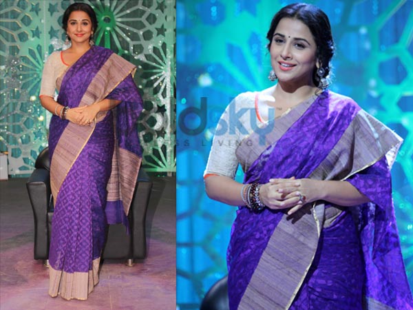 இதுவரை வித்யா பாலன் மேற்கொண்ட ஸ்டைலை விட, இந்த முறை ராயல் நிறமான நீல நிற மோவ் புடவையில் வித்யா பாலன் அழகாக உள்ளார் தானே!