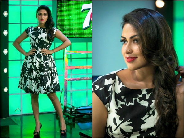 டிவி நிகழ்ச்சி ஒன்றிற்கு முழங்கால் அளவுள்ள கருப்பு வெள்ளை கவுனில் வந்த அமலா பால்!