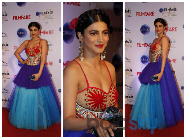 நடிகை ஸ்ருதிஹாசன் பிலிம்பேர் கிளாமர் மற்றும் ஸ்டைல் விருது விழாவிற்கு டீப் நெக் கொண்ட கிரிஸ்டி டீ சுன்ஹா கவுனில் கலக்கலாகவும், செக்ஸியாகவும் வந்திருந்தார்.