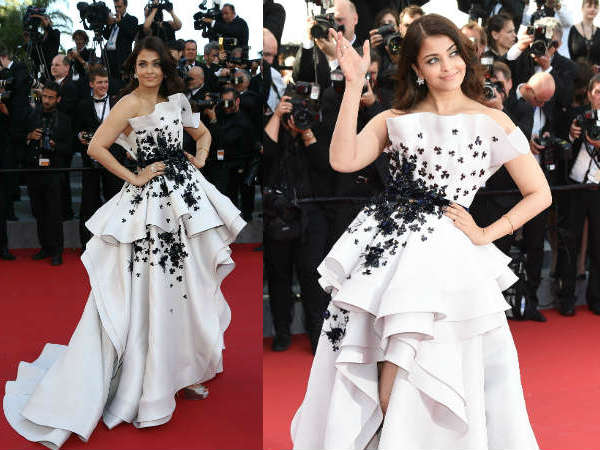 ஒவ்வொரு வருடமும் தவறாமல் கேன்ஸ் திரைப்பட விழாவில் கலந்து கொள்ளும் ஐஸ்வர்யா ராய் பச்சன், இந்த வருடமும் கலந்து கொண்டார். அப்படி கலந்து கொள்ளும் போது முதல் முறை பச்சை நிற கவுனில் வந்திருந்தார். இரண்டாம் முறையாக வந்த போது அழகான ப்ரில் கொண்ட வெள்ளை நிற ஸ்ட்ராப்லெஸ் கவுனில் தேவதை போன்று வந்திருந்தார்.