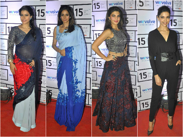 நடிகை ஸ்ரீதேவி மனீஷ் மல்ஹொத்ரா டிசைன் செய்த நீல நிற புடவை அணிந்து, மின்னும் வைர கம்மல் அணிந்து வந்திருந்தார்.