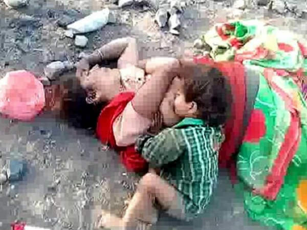 மத்திய பிரதேஷ் மாநிலத்தில் நடந்த சோகமான காட்சி. தாய் இறந்தது தெரியாமல் பால் குடிக்க முயற்சித்துக் கொண்டிருந்த பச்சிளம் குழந்தை.