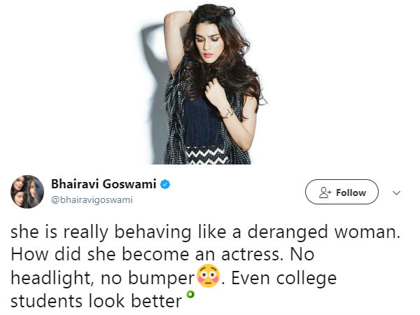 ஹேட் ஸ்டோரி என்ற "அற்புதமான" படத்தில் நடித்தவர் தான் இந்த பைரவி கோஸ்வாமி. கிருதி சானோன் எனும் வளர்ந்து வரும் நடிகை, அர்ஜுன் கபூரின் படத்தில் வரும் ஹவா, ஹவா பாடலுக்கு நடனமாடி வீடியோ ஒன்றை ட்விட்டரில் பதிவு செய்திருந்தார்.