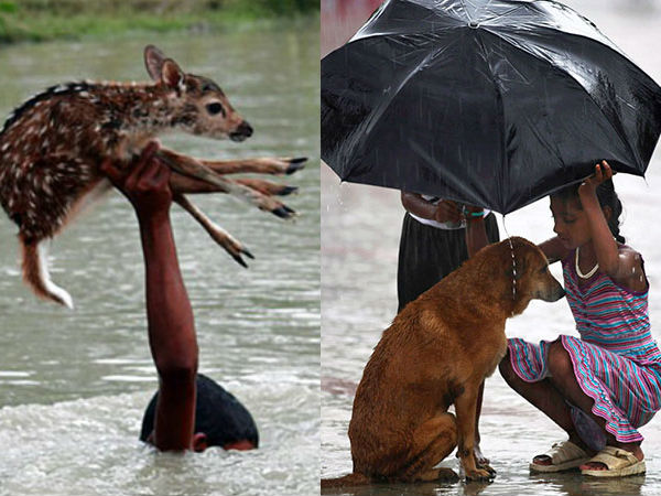 மும்பையில் நல்ல மழை அன்று. தெருவில் குடை ஏந்தி வந்துக் கொண்டிருந்த சிறுமி. ஒரு தெருநாய் மழையில் நனைந்து கொண்டிருப்பதை கண்டு, தனது குடையில் அந்த நாயிக்கு அடைக்கலம் கொடுத்த போது எடுக்கப்பட்ட படம் இது.