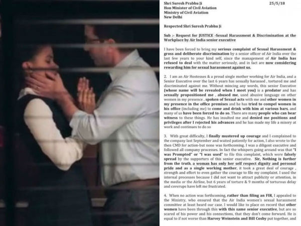 பெயர் வெளியிடப்படாத ஏர் இந்தியா விமான சேவை நிறுவனத்தில் கடந்த பல ஆண்டுகளாக பணிபுரிந்து வரும் ஒரு பெண்... தனக்கு தொடர்ந்து ஆறு ஆண்டு காலமாக மேலதிகாரியால் நேர்ந்த செக்ஸுவல் கொடுமைகளை ஒரு லெட்டரில் பகிரங்கமாக வெளிப்படுத்தியுள்ளார்.