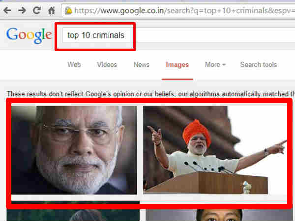 கூகுள் தேடல் எனப்படும் கூகுள்.காம் இணையத்திற்கு சென்று அங்கு, "Top 10 Criminals" என்று தேடல் செய்தால், அதில் நமது இந்திய பிரதமர் மோடி அவர்களின் புகைப்படங்கள் மேல் வரிசையில் காட்டப்படுகிறது.