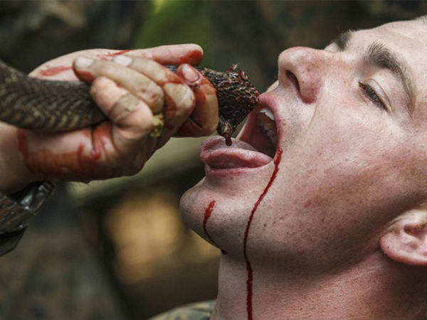 அமெரிக்க கடல் படை வீரர்களுக்கு வழங்கப்படும் மற்றுமொரு திகைப்பூட்டும் பயிற்சி, கோப்ராவின் இரத்தத்தை குடிக்க வைப்பது. கொப்ராவின் தலையை பிழிந்து இரத்தம் ஊட்டப்படுகிறது, இதை இராணுவ வீரர்களும் மகிழ்ச்சியுடன் ஏற்கின்றனர் என்பது மேலும் வியக்க வைக்கிறது..