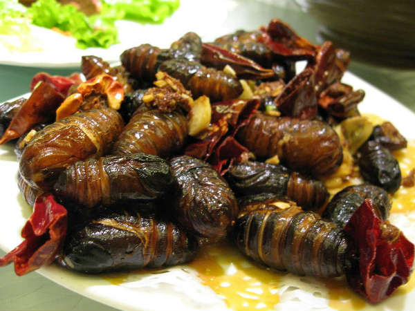 இந்தியாவில் சாப்பிடப்படும் விசித்திரமான உணவுகளில் ஒன்று தான் பட்டுப்புழு. அதுவும் அஸ்ஸாம் பகுதியில் வாழும் மக்கள் பட்டுப்புழுவை சமைத்து சாப்பிடுவார்களாம். அதுவும் இந்த பட்டுப்புழுவை அறுவடை செய்து, அதனை கொதிக்கும் நீரில் போட்டு அதிலிருந்து கிடைக்கும் மூலப்பொருளான பட்டு நூலை எடுத்துவிட்டு, எஞ்சியுள்ள புழுவை சமைத்து சாப்பிடுவார்கள்.