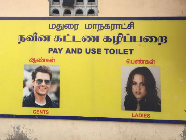 மதுரை பொதுக் கழிப்பிடம் ஒன்றின் வாசல் சுவரில் ஆண், பெண் வேறுபாட்டை காட்ட, ஹாலிவுட் நடிகர்களான டாம் க்ரூஸ் மற்றும் கிறிஸ்டன் ஸ்டீவர்ட்டின் படங்களை ஒட்டி லந்து கொடுத்துள்ளனர்.