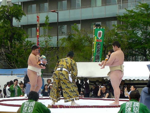 இந்த நகைச்சுவைமிக்க நிகழ்ச்சியானது சுமோ மல்யுத்த வீரர்கள் தங்களது கையில் கைக்குழந்தையைத் தூக்கியவாறு களத்தில் இறங்குவார்கள். இந்த போட்டியானது, எந்த மல்யுத்த வீரரின் கையில் உள்ள குழந்தை முதலில் அழுகிறது என்பதை அடிப்படையாகக் கொண்டு நடத்தப்படுகிறது. இந்த விழாவானது ஒவ்வொரு வருடமும் ஏப்ரல் மாதத்தில் ஜப்பானில் உள்ள கோவில்களில் நடைபெறும். 400 வருடங்களாக இந்த பழக்கம் பின்பற்றப்பட்டு வருகிறது. ஜப்பானிய மக்கள், இந்த போட்டியின் போது அழும் குழந்தை வேகமாக வளர்வதாக நம்புகின்றனர். மேலும் இன்றும் இந்த நம்பிக்கை அங்குள்ள மக்களிடம் உள்ளது.