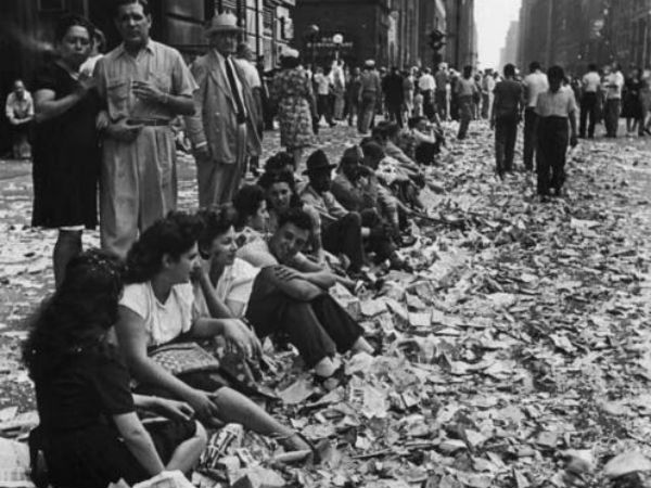 இதோ! 1945ல் இரண்டாம் உலகப்போர் முடிவடைந்ததை அமெரிக்காவின் நியூயார்க் மக்கள், கிழிந்த காகித துண்டுகளின் குவியலின் இடையே அமர்ந்து கொண்டாடிக் கொண்டிருந்த போது எடுத்த படம் இது.