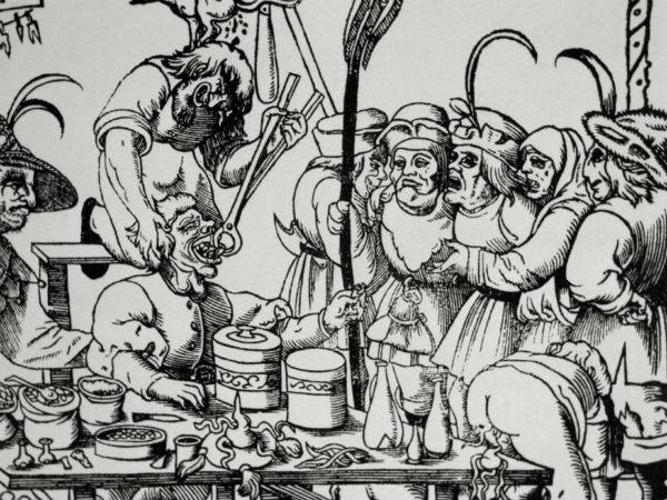 சொத்தை பல்லுடன் தன்னிடம் வந்த நபருக்கு, பல் பிடுங்கும் இடத்தில், வேறு கிடுக்கி மூலம் சூடு வைத்து, அதன் அருகில் இருக்கும் பல்லை பிடுங்கிக் கொண்டிருக்கிறார் ஆங்கில பல் மருத்துவர். இது 1810ல் வரையப்பட்ட ஓவியமாகும்.
