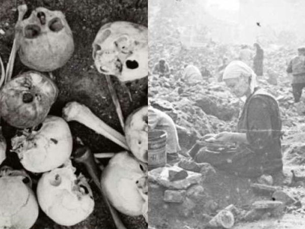 1944: லோட்ஸ் க்ஹீத்தோவின் மைதானம் ஒன்றில், உலகப் போரின் போது கொன்றுக் குவிக்கப்பட்ட நம்பர்களின் மண்டையோடும், எலும்பு கூடுகளின் குவியலும்.
